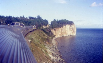 Departing Port Hawkesbury, we started inland across a low divide and travelled past MacIntyre Lake before we climbed to West Bay and over the top of the grade at Milepost 28 then descended to River Denys siding. Just before Orangedale was the first view of an arm of Bras D'Or Lake and after passing the station, a museum, I had my second look at an inlet of the lake. Further along, we crossed the Ottawa Brook on a curved trestle built in 1915 followed shortly thereafter by a shorter bridge as we travelled along more inlets of the lake. We passed the location of the former siding at McKinnon and moments later, were paralleling our namesake lake with its cliffs of white before cliffs of red. Absolutely beautiful!