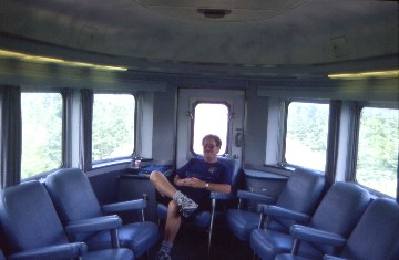 VIA 15 The Ocean 8/31/2000Ken Cairns and I had a good laugh as he handed me the fax and I told him that the missing materials had been already returned to me. He walked me out to a coach behind the dining car so I could experience VIA's newest innovation, Economy Plus, whose car's main function is to transport sleeping car passengers from Halifax to Moncton to board the turnaround sleeping cars that are added to the Ocean there. Coach passengers may also pay an extra fare to ride in the car as well and have access to the whole train by doing so, including the Park Car. Coffee and tea are provided as well as snacks and newspapers. I was told that after Moncton, the car would be mine.