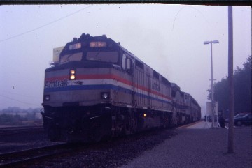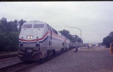The Cardinal 51 9/4/2000Leaving town about four hours late, I did see the RCA dome and State Capitol from the end of the platform then went to the dining car for French toast and had a delightful conversation with a couple returning home to Chicago and a woman going to Chicago to fly on Virgin Air to London. The meal hit the spot and I enjoyed a follow-up tea back at my seat as I watched the Indiana scenery. As the Cardinal approached Lafayette, it gave me an opportunity to see the railroad's relocation around town; I do miss the street-running with the stop at the station there. We stopped at the new station before making our way out of town on the former Monon Railroad and at the town with the same name, we curved off to the west to Rensselaer. Due to the padding in the schedule, we continued to make up time, now only two hours and twenty minutes late.