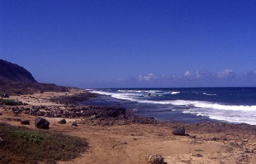 On my southern return, I made a side trip up the Waianae Valley just to see what was up there then retraced my route back to Interstate H1 and exited at Highway 750 crossing the saddle of the island with the pineapple fields owned by Dole. I passed through the Scofield Barracks before taking Highway 830 down to the North Shore to Highway 930, which I took west to the end of the road to the north part of Kaneana State Beach, where I laid out on an empty north shore beach. Returning east, I made my way to Highway 83 which would take me around to the east side of Oahu.