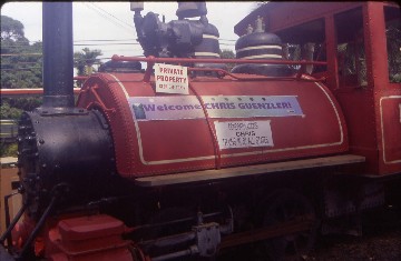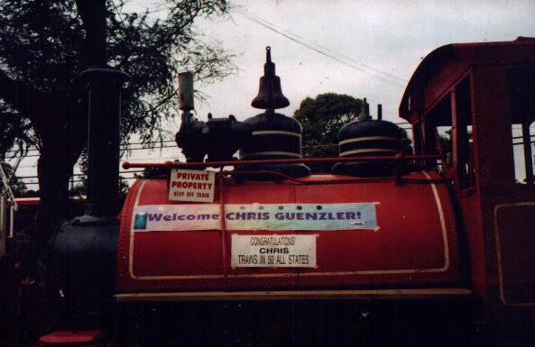 The top one read "Welcome Chris Guenzler" in the form of a banner and the one under stated "Congratulations 50 States 50 Train Rides." I was extremely proud and deeply touched by all this and was photographed by the steam engine by various people. Larry then introduced me to the other members of the society who came out for this event and they congratulated me on what I was about to accomplish. I visited their gift shop and bought several souvenirs then Will Hoover of the Honolulu Advertiser newspaper arrived and we repeated the pictures then toured the grounds with me as the guide.
