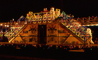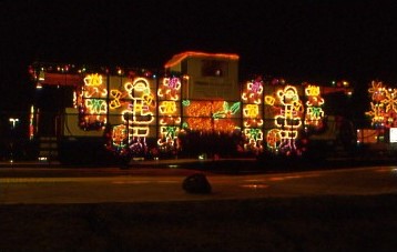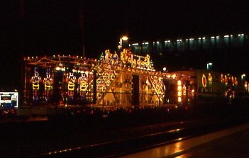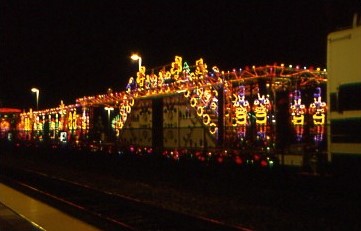 Every Holiday Season Metrolink, our excellent Southern California commuter train operator, runs the "Metrolink Holiday Toy Train Express - Christmas Train" to almost all the stations on the lines they serve. A different program is presented every year and toys are collected for the Spark of Life Toy Drive. The train is scheduled and runs in the evenings unless it is raining, then those dates are rescheduled. So now enjoy the view of over 30,000 lights on the 2001 version of the Metrolink Holiday Toy Train Express at Irvine.