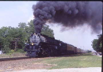 That gave me time for an ice cream cone before the third runby occurred and everyone reboarded. The climb up Rolla Hill was spectacular and the sound of the engine even more incredible as it echoed through the cuts and off the surrounding hills. The vestibules were overflowing with passengers, so much so that an Amtrak official could not make his way through the train and ordered all the top dutch doors to be shut for the reminder of the excursion. We were running so far ahead of schedule that another double photo runby was held in Lindenwood Yard on the shady side, as had been done during the Norfolk Southern steam trips. We still arrived in St. Louis early and with the bus ride back to the hotel, the 2001 NRHS convention ended. I went to bed right away as I had a 4:25 AM train to catch to Chicago.