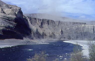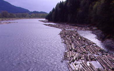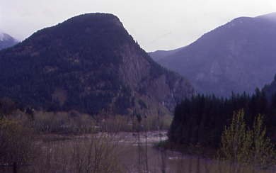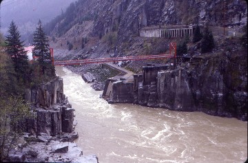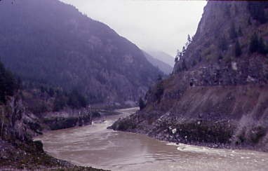 The view towards Hells Gate. This is a narrow rocky gorge of the Fraser River Canyon south of Boston Bar. Explorer Simon Fraser recorded a difficult portage in 1808 around the churning waters of this section of the Fraser River. First known as the "great canyon," its name is associated with the disastrous impact of Canadian Northern Railway construction on the river's salmon resources. In 1913, what became the Canadian National Railway hewed its way through the Rockies and the treacherous Fraser Canyon. While blasting for the passage of the railway, a rock slide was triggered which partially blocked the Fraser River at Hells Gate. A dramatic drop in the salmon run resulted.