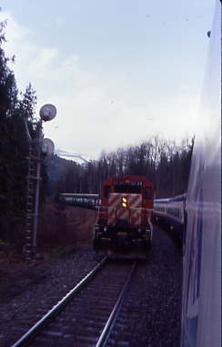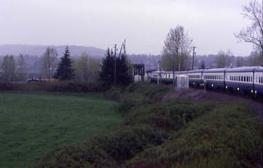 My day started pre-dawn as I checked out of the Day's Inn and rode Skytrain to Pacific Central Station, where I checked in with the Rocky Mountaineer Staff and received my car/seat assignment. I went for MacDonald's in the station for breakfast before doing a few word fill-in puzzles until boarding time. With a toot of a train whistle, I led the way to the train and was the first passenger of the 2001 season to board, climbing onto car seven of a twenty-two car consist. Although it started to rain, nothing was going to damper my enthusiasm at the start of this rail journey. My car attendant, Tina, handed out letters to all passengers which, when held up in order, read "Cheers! To a great 12th Season". I held up the "S" and the exclamation point. As we departed Vancouver, we gave all the employees a big send-off with the letters and waving. The entire office staff of Rocky Mountaineer were on the ground to see us off and I wondered if we won the contest that the onboard crews were having? I hoped so.