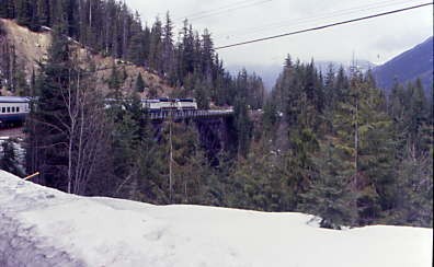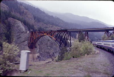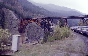 Our train then went under Canadian National's bridge, a truss arch bridge, 810 feet long and 220 feet high with its northwest abutting into a near-vertical rock face. The southeast end of the bridge crosses the CPR tracks about 330 feet north of the CPR bridge. In other words, the railroads switched sides of the canyon. This was necessary because the Canadian Pacific built through the canyon first and took the easier route, with the Canadian Northern building through here on the other side of the canyon. Canadian National did have the advantage of more modern construction methods. Cisco was a truly spectacular place.