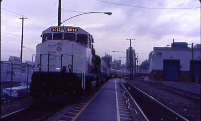 Rocky Mountaineer Railtours GP40-2LW 8013, ex. Alstom 9621, nee Canadian National 9621, built by Electro-Motive Division in 1975, was the sole power for our train. Our route out of the city was the same as VIA Rail's Canadian, although the large big difference, and selling point, is the all-daylight operation which enables passengers to see all the scenery.
