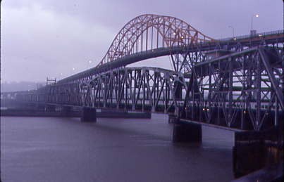 The Cisco Bridges, where both the CP and CN changes sides of the Fraser River Canyon. The Canadian Pacific version is a three-span, 520 foot truss bridge with two short Pratt truss spans at each end of the longer Parker truss main span. The south end of the bridge enters directly into the Cantilever Bar Tunnel and the original span, built by Joseph Tomlinson, was pre-fabricated in England and shipped to Canada in 1883. The bridge, then one of the longest cantilever spans in North America, was then constructed by the San Francisco Bridge Company. When the current bridge was built at Cisco in 1910, the original span was moved to the Esquimalt and Nanaimo Railway on Vancouver Island to cross the Niagara Creek Canyon.