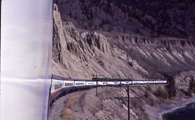 Towards the front of our train.The first area of this canyon that we entered is known either as Painted Canyon or Rainbow Canyon for the vivid colours in the rocks. The Canadian Pacific line was built on the south side on a ledge above the river and has the easier route, while the Canadian National line plunges through eight tunnels and rock sheds to achieve their route through the canyon. It was truly spectacular and I was happy knowing that I would be riding on the Canadian National route through here in daylight in three days.