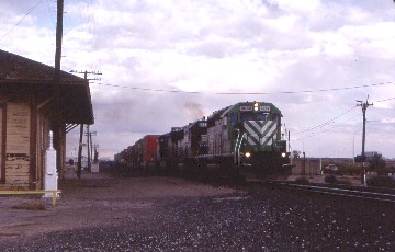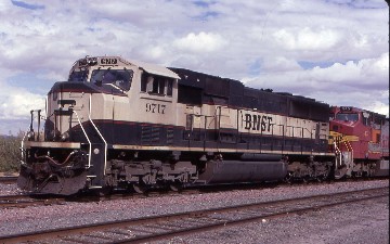 A further walk netted me BNSF SD70MAC 9717, built by Electro-Motive Division in 1996, in the Grinstein scheme, followed by two Union Pacific freights with the westbound in the siding. I walked the short distance to the Texaco station for postcards and enquired about a rock shop so I could get some more rocks for Mrs. Angle, the science teacher, and was given directions to one a mile north of town. I walked out to it but it had just closed five minutes before my arrival. Their loss was my gain as I felt I needed some exercise.