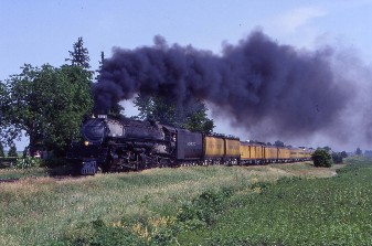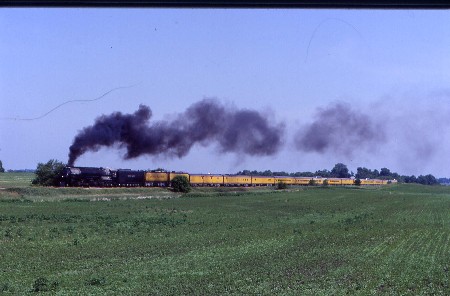 Union Pacific 3985 to Kansas City 6/23/2002Day two of our journey down the former Rock Island "Spine Line" behind the world's largest operating steam locomotive started off riding the vestibule on my brother Jon's birthday; it seemed that every year I was on a train on his birthday. Union Pacific 3985 departed Des Moines at 8:30 AM and proceeding out of town, crossing former Chicago and North Western, Dakota, Minnesota and Eastern and Burlington Northern rail lines before making our way to our crossing of the Des Moines River. We travelled south through the forests and rolling hills crossing the North River and passing through Carlisle, where the pacers and chasers soon discovered that Iowa Highway 5 was closed. Our train crossed the Middle River, passed through Hartford, crossed the South River and at Beech, the church services were held outside so parishioners could wach Union Pacific 3985 steam through. Just as yesterday, everyone was out to watch the Challenger pass through their town. At the old site of Purdy, Iowa, a pair of photo runbys were performed, complete with a steam tractor on the west side of the tracks. The local sheriff ran all of the locals out of the location and a special thanks to Butch the farmer for the use of his land, as well as the Camerail members, who prepared the site. It was an excellent set of photo runbys.