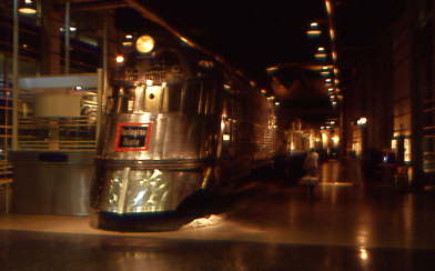 My timing was perfect as a tour of the train was about to occur. We would board and go back in time to ride the record-breaking trip from Denver to Chicago in 1934 and we were taken into the baggage room and the train started moving, real motion added to stimulate the train going down the tracks. Next we walked into the express room where we met Zeph, the talking mule who told his story about the amazing run of the Zephyr. This was followed by sitting in the men's coach section, or smoking area in those days. Next we went into the regular coach section where mechanical passengers told us about their journey. Through the rear door, we went into the first class section getting to meet Mr. Budd of the CB&Q, along with his daughter and granddaughter, who through the use of video in the rounded rear-end observation windows, showed us views of the journey and arrival in Chicago, the Chicago Fair and fireworks.