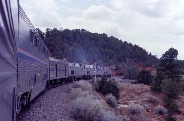 At Canyoncito we went into the siding and I went to the lounge car for the passage of the 17-car eastbound Southwest Chief, followed by our trip through Apache Canyon to Lamy and on into Albuquerque, where we had an hour and twenty- five minute layover. I walked to a store in town for a USA Today before calling home, then Trainweb, to learn that the Mighty Ducks of Anaheim had defeated the Dallas Stars as one cannot obtain a West Coast sports score due to the lateness of the game compared to when the newspaper has to be ready to go. I bought Karen, my wonderful Amtrak agent in Solana Beach, a blanket from one of the vendors at the station.