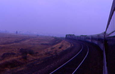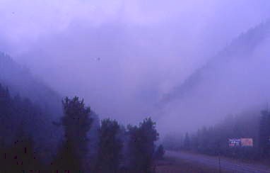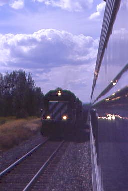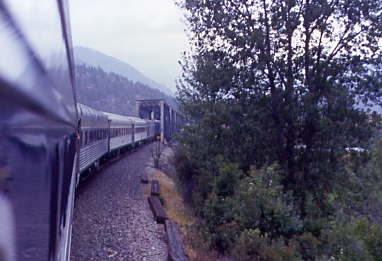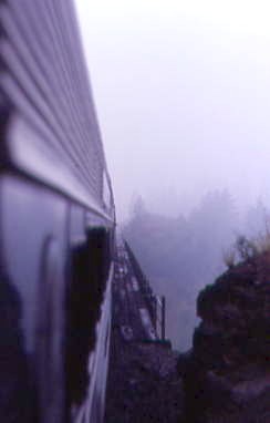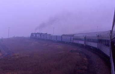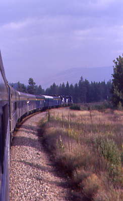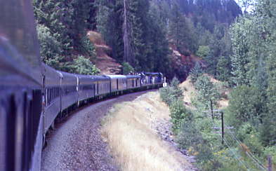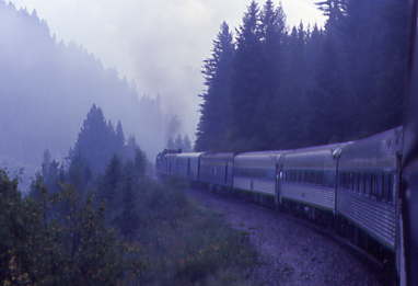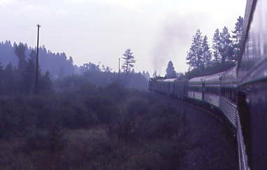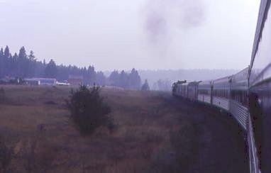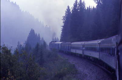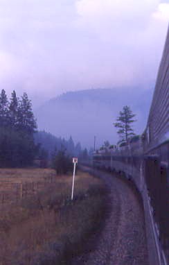 Climbing Evaro hill into the smoke and clouds on a steady climb with our two SD19-1's working hard. I watched the train round every curve from the vestibule and it was an incredible ascension.