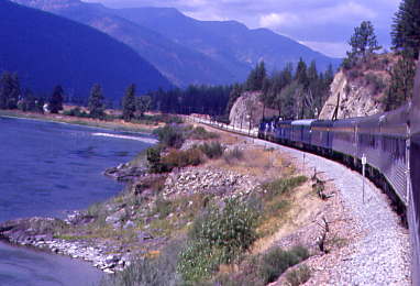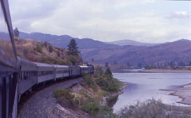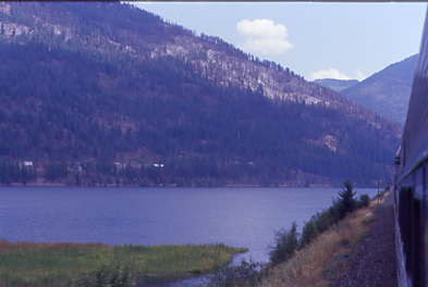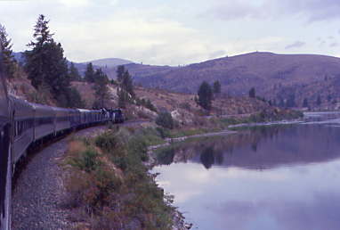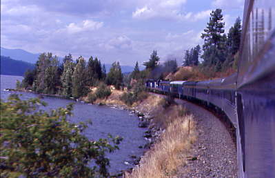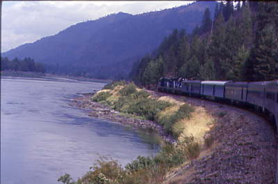 Our route was joined by the line that runs through St. Regis, that we last saw at De Smet and I hoped we would return via that route. We followed the Flathead River west to Paradise, stopped to inspect the train and while there, spotted three grizzly bears across the river climbing the steep slope. Further west, the Mission Mountain Range came into view as the train snaked through some curves above the Flathead River before Perma at Milepost 51.6.
