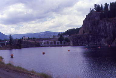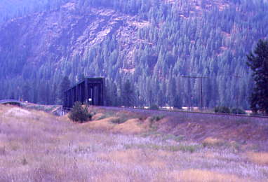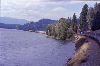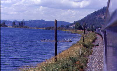 The scenic Noxon Reservoir with its Noxon Rapids dam and power plant near Milepost 66 through the trees. To our north were the Cabinet Mountains, while on our south were the Bitterroot Mountains, whose summits make up the Montana/ Idaho border. We ran along the Cabinet Gorge Reservoir to Milepost 73, but the forest blocked most of the view. Heron, Milepost 80.1, was the site of a line relocation which caused the siding to be separated from the mainline by a hundred feet to the north. We left Montana and entered Idaho, passing the back of the Cabinet Gorge Dam and Power Plant at Milepost 73.