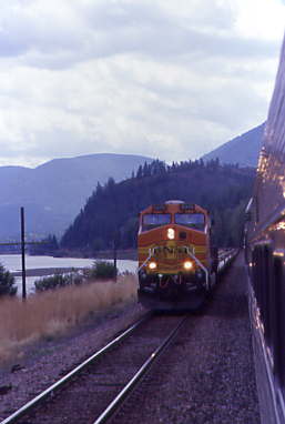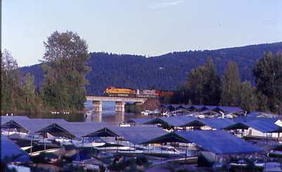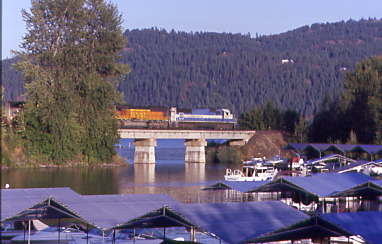 Later, a westbound passed through. We sat outside on the deck overlooking Sand Creek with the marina and the BNSF bridge over the opening to the harbour. This is the Funnel as it carries all BNSF and MRL traffic for Sandpoint Junction and Spokane, up to sixty trains a day.