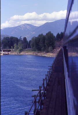 One last looking back across the causeway, after which we travelled through the town of Hope, Milepost 103.5 with its houseboat marina, crossed Trestle Creek at MP 106.5 then the final highlight of our trip west, the second causeway across the beautiful Lake Pend Oreille, which was really spectacular and lived up to everything I had heard about it. Absolutely fantastic is how I would sum it up.