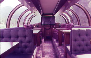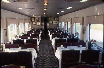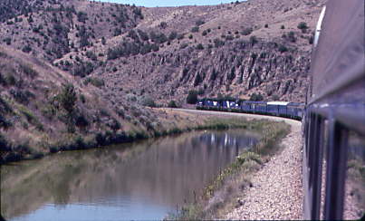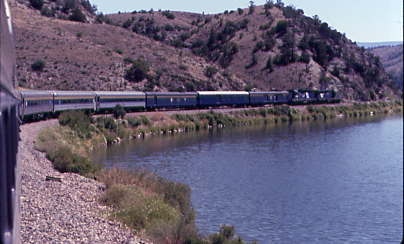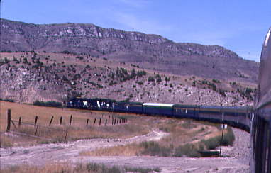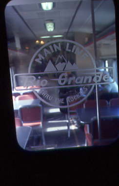 The bus picked us up at 8:45 AM for the ten minute drive to the train in Pomeray. We were boarded in Big Sky service for our eastbound trip and were seated in the lounge area of Denver and Rio Grande Western dome car, which still had its herald on the door window at the B end of the car. In Big Sky Service, one could sit in one of the three dome cars with that wonderful 360 degree panoramic view of the beautiful landscape. Seats in First Class seating on the lower level had nice comfortable lounge chairs with large side windows so you never miss anything. Lunch was in the dining car served on china in one of two seatings, as well as being waited on by the friendly staff at your seat. They gave each passenger a keepsake "Big Sky" lapel pin and all passengers had access to the lounge car for bar and gift services.