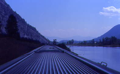 The full train as seen from the rear platform. From just east of Cyr to De Smet, I enjoyed the views from the covered rear open platform and at Milepost 157, we went through the 350 foot Philemon Tunnel. A few miles later, we crossed the Clark Fork River for the last time before entering the Missoula Valley, which was almost clear of smoke. It looked to me as though those rains that fell did a lot of good in clearing the air. We passed though Frenchtown at Milepost 136.6 before travelling to Schilling, which is home to the Smurfit Stone Container Corporation Linerboard Mill, Montana Rail Link's biggest shipper. The Bitterroot Mountains were seen to the south with Lolo Peak at 9,075 feet topping the view. To the north was the 7,999 foot Crazy Women Peak in the Rattlesnake Mountains.