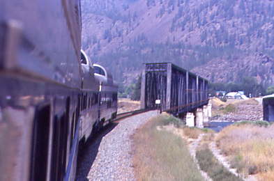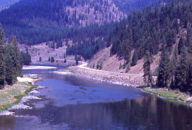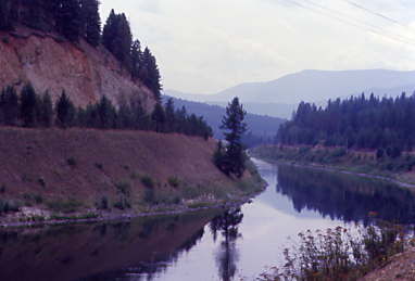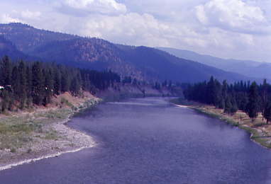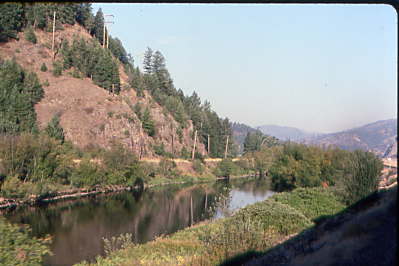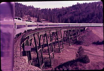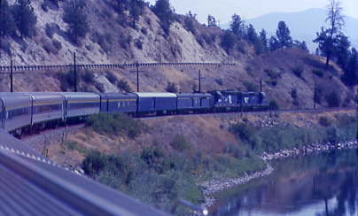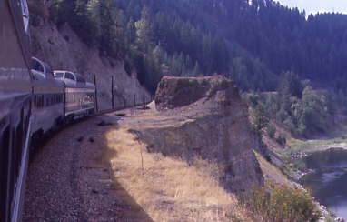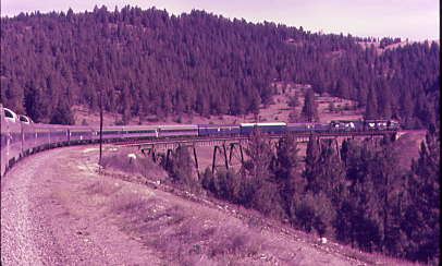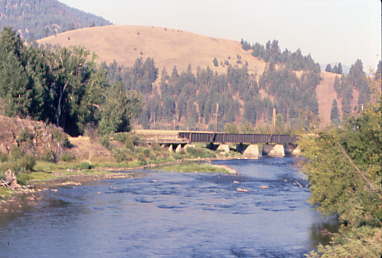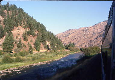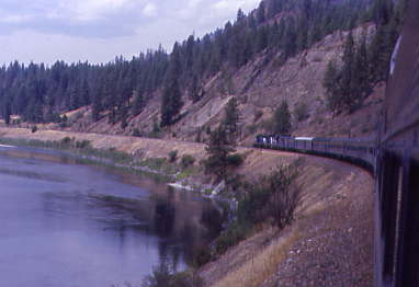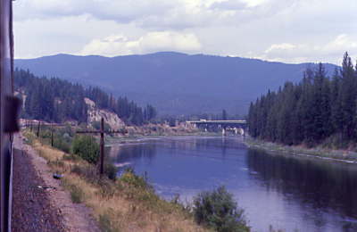 The Montana Daylight has passed through St. Regis and has turned east, still following the Clark Fork River. The former Milwaukee Road bridge can be seen in the distance.