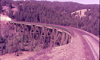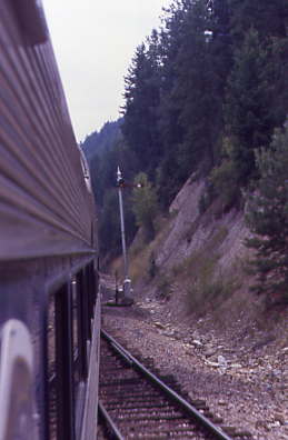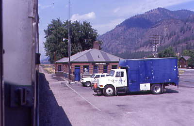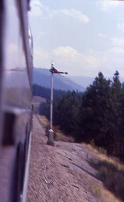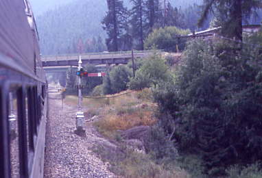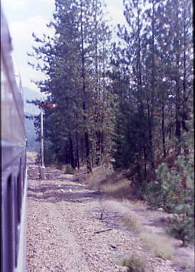 Entering St. Regis, Milepost 197.2, we were greeted by this unique semaphore signal, and were now on what was once the Northern Pacific's Couer d'Alene Branch completed in 1891 from De Smet to Wallace, Idaho, to access Idaho's Silver Valley. The Burlington Northern abandoned the line west of St. Regis in 1980.