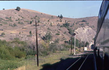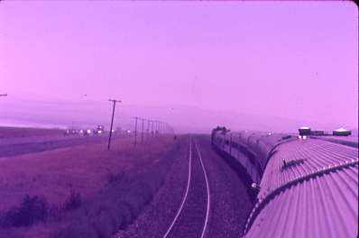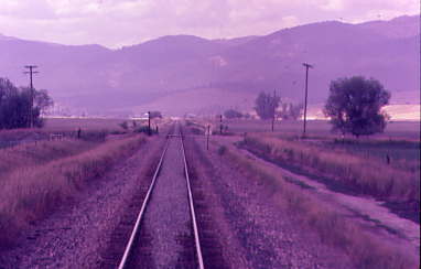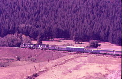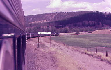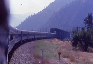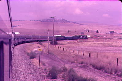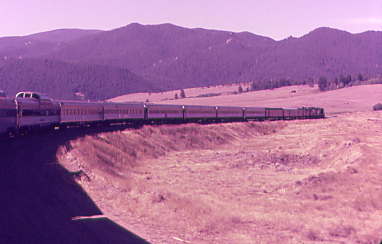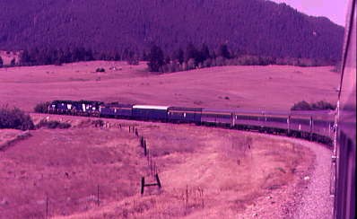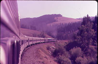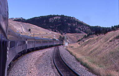 The air smelt so clean as we neared the summit. We went though Garrison Tunnel before reaching Garrison where the Butte Line takes off to the south. After that, I went inside the dome car to relax until near Blossburg, then we entered the siding at Elliston to wait for a westbound military train before starting our ascension of the western slope of Mullan Pass.