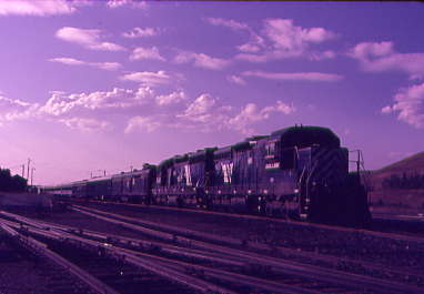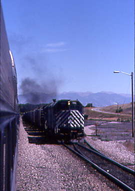 At Logan, we rejoined the Butte Line where an MRL local from Whitehall was sitting, while in the siding was a westbound MRL freight with F45 391 on the point.