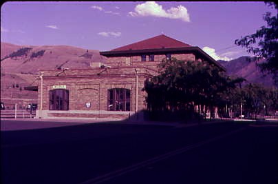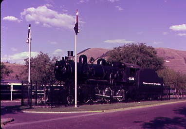My mother and I detrained, receieved our hotel key and boarded the bus for the Holiday Inn Parkside once again. After relaxing, I walked to the Missoula Carousel and back before we went to Nap's Grill for dinner, which specializes in hamburgers, steaks and malts. I walked back to the station for a picture in the sun.