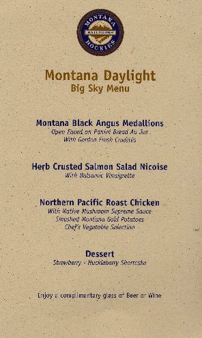 Today's menu, and the four of us at our table, which included the two New Jersey railfans, ordered the Black Angus Medallions. Liz was our server again and was excellent. While we were waiting for our meal, the Montana Daylight went into the siding at Louisville for another westbound freight train. I enjoyed my beef and the dining experience was light years away from anything Amtrak has on their system. The meal was as good as any of the dinner trains I have sampled over the years.
