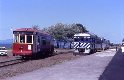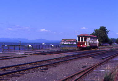 The Riverrront Trolley passing the RDC's as passengers were returning to board for the trip back to Linnton.