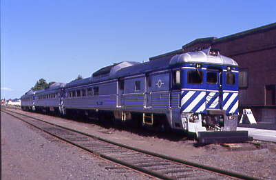The Lewis and Clark Explorer trainset, led by Oregon Department of Transporation RDC-3 BC-31, ex. British Columbia Railway BC-31:2, ex. Amtrak 43, exx. Burlington Northern 2350, nee Great Northern 2350 built by Budd Company in 1956. The middle was Oregon Department of Transporttiaon RDC-1 BC-10, nee British Columbia Railway BC-10 built by Budd Company in 1955. The rear RDC was Oregon Department of Transporttion RDC-1 BC-11, nee British Columbia Railway BC-11 built by Budd Company in 1956.
