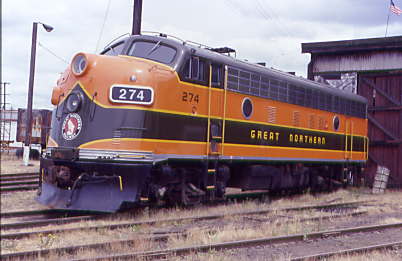 On one of the turntable leads, in perfect light, was Great Northern F7A 274, ex. Pete Replinger 274, exx. Seattle and North Coast 101, exxx. Burlington Northern 610, nee Great Northern 274B built by Electro-Motive Division in 1950.