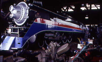 After that we went into my old dear friend, Southern Pacific 4-8-4 4449. It is the only surviving example of Southern Pacific's GS-4 class of steam locomotives. GS stands for "Golden State", a nickname for California (where the locomotive was operated in regular service), or "General Service." The locomotive was built by Lima Locomotive Works in May 1941; it received the red-and-orange "Daylight" paint scheme for the passenger trains of the same name which it hauled for most of its service career. Number 4449 was retired from revenue service in 1957 and put into storage. In 1958 it was donated, by the railroad, to the City of Portland who then put it on static display in Oaks Park, where it remained until 1974. It was restored to operation for use in the second American Freedom Train, which toured the 48 contiguous United States for the American Bicentennial celebrations. Since then, 4449 has been operated in excursion service throughout the continental United States.