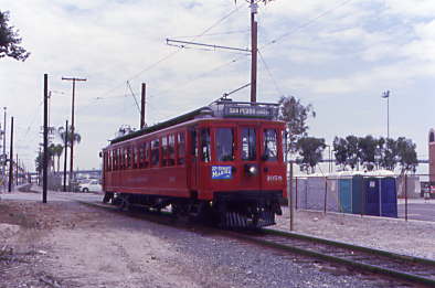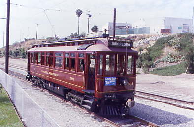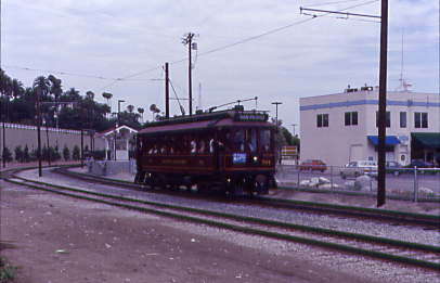 The cars to be used on this future 1.5 mile waterfront rail line included car 1058, a vintage Red Car, that began its life as a Pacific Electric 950-Class car being built as a standard wooden car 953 in 1907. The car was found after its retirement in 1950 in very bad shape at a water heating company in Compton by Richard Fellows. He saved the car and moved it to his boat yard, which was next to National Metals on Terminal Island in those days. Richard liked the PE 1000-series cars so he lengthened the frame to restore it as PE 1058, one number higher than the last 1000 car built.