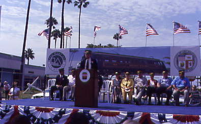 The next speaker was Tom LeBonge, who mentioned that the redevelopment of the port will stretch from the Vincent Thomas Bridge to the breakwater. Betty Karnette, 27th District State Senator, was the following speaker and told the audience that she too grew up in Southern California and rode the Red Cars. Debra Bowen, State Senator 28th District, informed those gathered of the amount of paperwork involved in getting the Red Cars back on track and running. Several of the speakers started a running joke by saying that lots of paperwork was required by Sacramento, whoops, San Francisco, where the California State Public Utilities Commission is located.