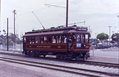 500 and 501 are painted in "No 1 Electric Line Red" adopted by the PE in 1915. The cars are 43 feet long and weigh 58,500 lbs and seat 48 with space for 42 passengers standing. Inside each car, patrons will experience the early 20th Century, complete with authentic product advertisements. The 1.5 mile line was part of this 9.5 million dollar project that was built by the Port of Los Angeles. The line can accommodate the trolley with its 600 volt DC overhead wiring. The line is shared with freight traffic at night and derails are in place at each location where a freight could enter the line while the trolley service is in operation. The four stations are ADA-complaint high level platform with ramps that make loading wheelchairs easy. Each trolley can accommodate wheelchairs so anybody can ride these wonderful cars. Service is on Friday through Mondays.