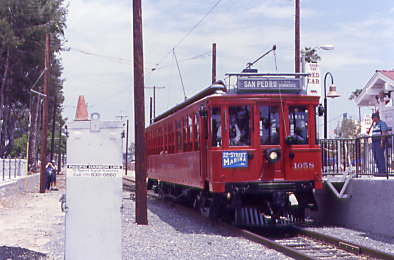 We then drove over to San Pedro and went to Marina station where the car tent was located and in a trailer, David L. Garcia of Herzog Transit Services Inc., gave us a nice interview about the project and the cars. From there we drove to the Port O'Call station where we found the two Red Cars getting ready to attend the opening ceremonies and the two of us managed to get aboard 501 for the trip over. What a fantastic job the employeed did building this car as it is extremely impressive both inside and out. 1058 ahead of us and our 501 were both carrying the VIP's and once on the move, we followed it to the Downtown Station at 6th and Harbor Drive. After everyone had disembarked from 1058 and it pulled forward, it was our turn to pull in to the cheers of the crowd and the rolls of the drums.