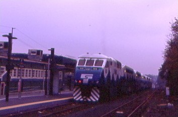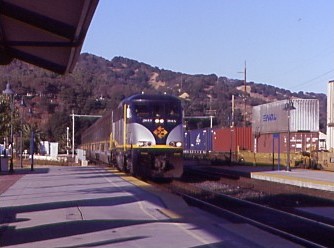 11/11/2003 I was up for the day about ten miles outside Sacramento on the former Western Pacific and we arrived at Sacramento seven minutes before the scheduled departure time of 6:37 AM. The P42DC's were refuelled and I was in the dining car waiting for my French Toast breakfast then returned to my room before we reached Davis at 7:13 AM {6:50 AM}. I relaxed the rest of the way to Martinez on a beautiful clear morning with a nearly full moon in the Western sky. We arrived at 7:52 AM, a mere eighteen minutes late, but with plenty of time to make my connection at 8:23 AM for Bakersfield. This ended a very relaxing and restful trip on the Coast Starlight.