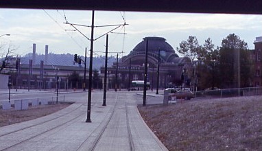 A banner-sized photograph of the first light rail car from Skoda. The car returned twenty minutes later at 10:06 AM and I was off for my first ride, proceeding west down 25th Street from the Tacoma Dome station to 25th Street station, after which we turned right onto Pacific Avenue. A brief view of the BNSF yard was visible down the side streets of 23rd and 22nd Avenues. The line became double-tracked on the way to the next stop at Union Station, home to the a federal courthouse. To the east of there is the Washington State History Museum and across the street to the west was the University of Washington-Tacoma. We turned off Pacific Avenue to the northwest and climbed a short hill to reach the Convention Center stop on Commerce Street.