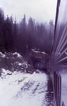 11/08/2003 Waking up to a rainy world outside is always a highlight of rail travels as it is all viewed from the warmth of the train. I went to the dining car for French Toast as we passed through Castle Crag and I was having a shower during our Dunsmuir stop. I rode in the Pacific Parlour Car as we left the Sacramento River Canyon, passing the forests in late autumn colours under very cloudy skies and seriously doubted that Mount Shasta would be making an appearance on this northbound trip.