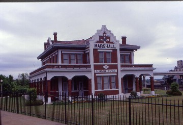 We reached Marshall with the beautiful Texas and Pacific station built in 1912. It contained a waiting room as well as the company's eastern regional administrative offices. The three-story, 7,500 square foot structure is the only survivor of a once bustling 66-acre shop complex comprised of 75 buildings that included a roundhouse, car shops, a water tower and a warehouse. Today, the beautifully restored depot houses an Amtrak stop and the Texas & Pacific Railway Museum. The exterior has remained essentially the same since its construction. The striking red brick building is outlined in white and features a projecting center bay with a prominent porch, giving the station a homey-feel. The interior has been significantly altered over the years to meet modern railroad needs. During a major rehabilitation in 1999, whitewash was removed and the original red brick restored.
