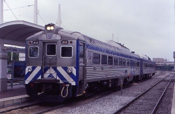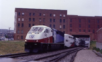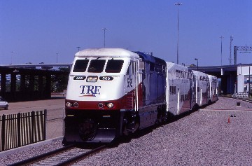 Trinity Rail Express 2936 4/24/2003Named after the Trinity River, the West Fork of which flows from Fort Worth to Dallas, the TRE was launched on December 30, 1996, shortly after the inaugural service of Dallas' DART light rail system, operating from Dallas Union Transit Station to the South Irving Transit Station. It runs along a former Chicago, Rock Island & Pacific line that the cities of Dallas and Fort Worth purchased in 1983 for $34 million. Service initially operated only in weekday rush hours, but midday and evening service was added in December 1997 and Saturday service was added in December 1998. On September 18, 2000, the line was extended to the suburb of Richland Hills and, for the first time, there was rail service available between downtown Dallas and Dallas/Fort Worth International Airport. On November 13, 2000, the West Irving Transit Station also opened. On December 3, 2001, the TRE was extended to its current terminus at the T&P station in downtown Fort Worth.