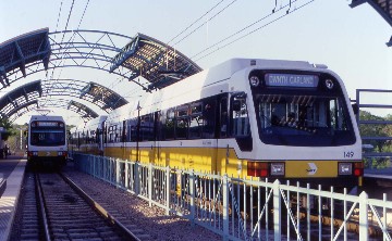 DART Light Rail 4/25/2003The DART Blue Line was part of the initial launch of Dallas Area Rapid Transit's light rail service opened on June 14, 1996. At the time, the line only ran from Illinois to Pearl in the northeast corner of downtown. In May 1997, the Blue Line was extended south to Ledbetter and was extended along the Red Line to Mockingbird in September 1999, in preparation for the future extension to Garland. On September 24, 2001, the Blue Line extended to White Rock, just northwest of White Rock Lake. On May 6, 2002, the Blue Line was extended to the LBJ/Skillman, just beyond LBJ Freeway (Interstate 635). It was extended to Downtown Garland on November 18, 2002.