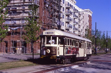 I met Doug Goldsmith, the operator, who was a very friendly person. On the trip we talked baseball, hockey light rail and of course, this line. The CityPlace station is on a stub-end of the track and we proceeded west to McKinney and at the junction, turned right then left onto Blackburn, passing the Magnolia Theater before turning left onto Magnolia Street. The car rode smoothly and provided an enjoyable ride. We went down Magnolia and turned ight to gain access back to McKinney, passing the Uptown Galleries, Hard Rock Café and the Crescent Hotel with its shops then turned onto single track at St. Paul, taking that street to the end of the line at Ross Street. After switching ends, we returned via McKinney and had a meet at St. Paul and McKinney.
