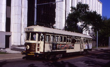 Around a corner came "Matilda", car 369, built by James Moore, Limited in 1926 for service in Melbourne, Australia, where she operated in continual service for six decades. MATA purchased the car in 1986, saving her from being scrapped. "Matilda" came to Dallas in running order and a few cosmetic changes were made at the site of what is now the Ritz-Carlton hotel in Uptown. This is the only car in the fleet with a center entrance and has some of the most beautiful woodwork in the MATA fleet.
