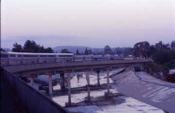 At El Monte, we took the flyover and since there were no express cars on the rear, photography was very easy. We ran down the Metrolink line in the middle of the San Bernardino Freeway in order to reach the Los Angeles River, which we crossed to get to Los Angeles Union Station, arriving there at 6:25 AM {7:55 AM}, an hour-and-a-half early.