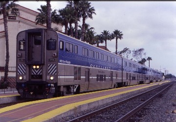 Pacific Surfliner 564 4/27/2003I walked across to Track 9 and found Pacific Surfliner 761 bound for Santa Barbara parked ahead of Train 564 bound for San Diego. However, when I saw engineer Bob Morgan, I knew I was in the correct place. About five minutes before departure, Joe Nappa took my ticket and we were on our way to Santa Ana. At Hobart, we passed a special Metrolink train on its way to the California 500 car race in Fontana. The BNSF dispatcher did an excellent job weaving us through the westbound BNSF fleet and we passed the on-time Southwest Chief just east of Norwalk. Pacific Surfliner 564 ran on time to Fullerton, Anaheim and to my stop of Santa Ana.