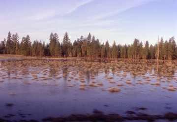 Mud Springs Lake on the way to Scarface, after which we proceeded to Lookout, the eastern junction with the McCloud River Railroad. The Starlight cruised across the Madeline Plain making its way to Bieber where the old water tank still stood. This was the end of the Great Northern-built trackage of the Inside Gateway. Now on the former Western Pacific, we descended to Pitt River, which we crossed on a low bridge.
