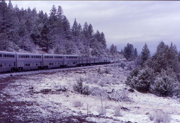 It started to snow as we neared Lodge Pole where we met our northbound counterpart, Coast Starlight Train 11, sitting in the siding. A few minutes later, we crossed Pine Creek Valley with the creek of the same name and I saw Windy Hollow to the southeast. The Starlight sprinted along at 40 MPH across Highway 44 and then along snow-covered Long Lake, making our way through the forest to Robbers Creek then continued on to Westwood. This was the end of my new mileage as I had ridden here behind the Feather River E9s in 1994. I was having a great day and wondered if it ever gets any better than this?